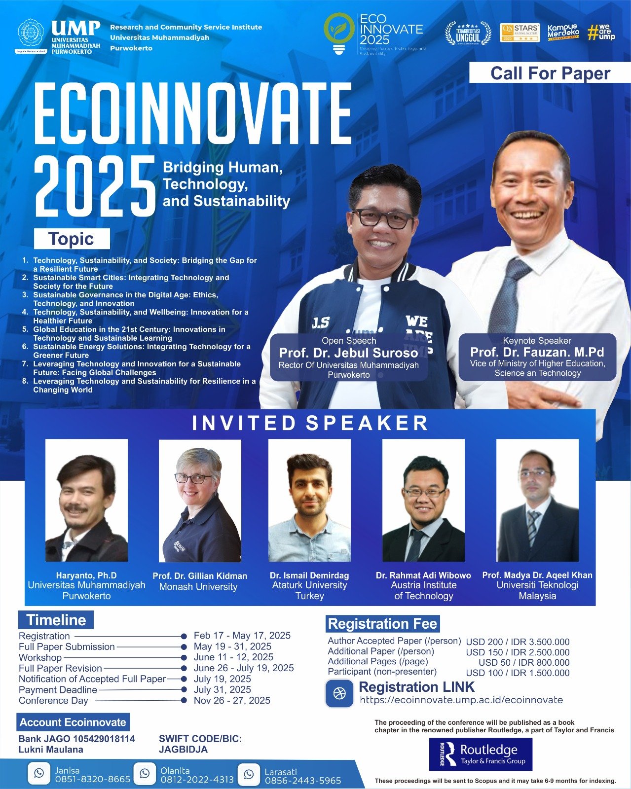 Welcome to EcoInnovate 2025: Bridging Human, Technology and Sustainability, a global platform for exploring the intersection of innovation, sustainability, and societal transformation. This event brings together experts and innovators to address some issues such as sustainable technologies, ethical use of AI, integrative health solutions, climate resilience, smart city development, reimagined education, responsible governance, and renewable energy innovations. EcoInnovate 2025 is a call to action, empowering a global community to bridge gaps between technology, humanity, and sustainability and to innovate for a better future. The submitted paper should follow the Author Guidelines and your registration as presenter or participant should follow the link Submit Your Paper.